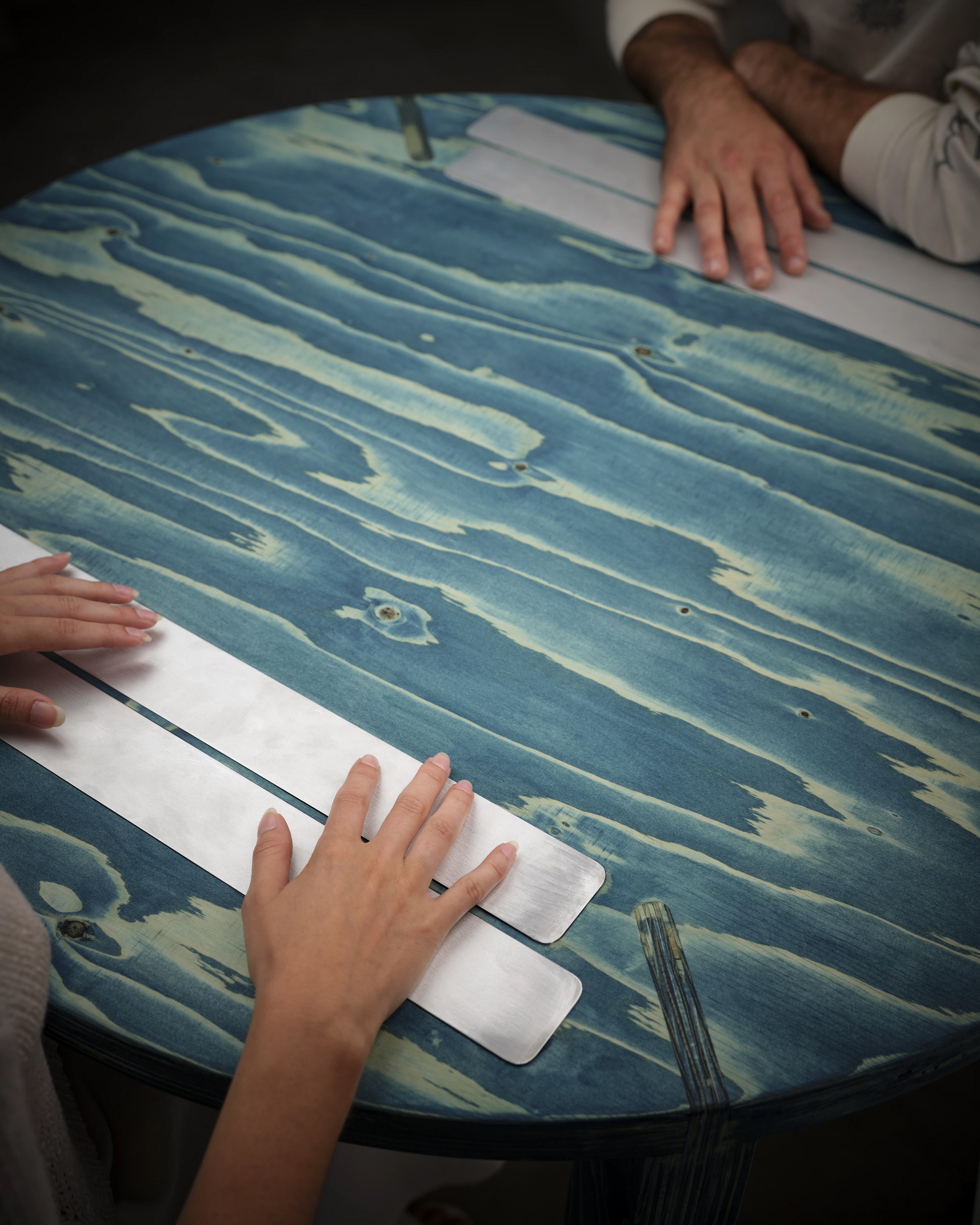 Resonance’, is a communication tool which fosters connection among users, as it facilitates the expression and comprehension of complex emotions and personal experiences. The physical interface of ‘Resonance’ takes the shape of a table, creating an environment for social interactions which users can intuitively control by touch. The interface translates participants’ emotional cues into sound waves with tones and frequencies corresponding to different emotions. This enables ‘Resonance’ to recreate physical sensations of another person’s emotional states.